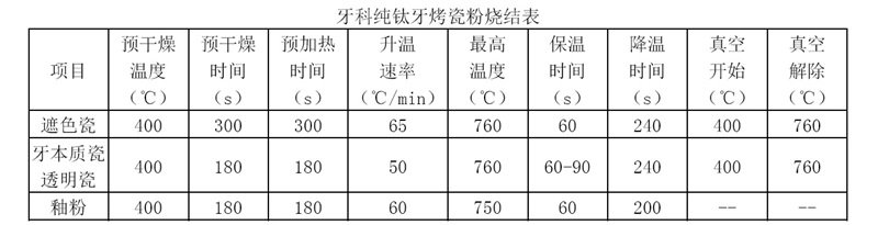 OP按燒結參數燒結,溫度可以略高但不可偏低,烤瓷燒結冷卻的時(shí)候注意設置一下冷卻溫度,否則正常的開(kāi)蓋速度會(huì )讓純鈦烤瓷因為瓷的溫度迅速降溫,而純鈦支架熱傳導比較慢導致蓄熱而產(chǎn)生裂瓷。同時(shí)因為純鈦的熱傳導低的原因,預熱溫度一般也會(huì )設置得比較低。純鈦是低熱傳導物質(zhì),所以純鈦的烤瓷程序的升溫速率一般都會(huì )設置得較低以獲得金瓷溫度的同步。